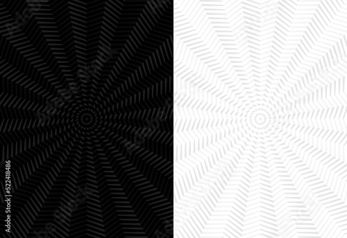 Abstract background pattern, white, gray, black. A circular radial illusion extending from the center. Twenty pointed star geometric shapes alternate dark and light colors. Vector illustration.