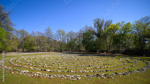 Labyrinth made of white stones on a green meadow near Beli on a sunny day in spring