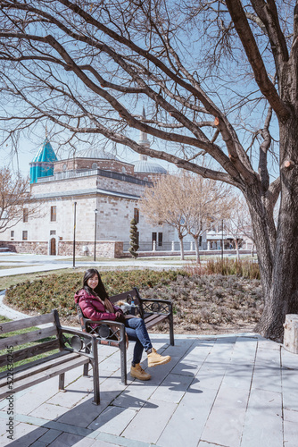 woman sitting on bench sitting in the park in turkey