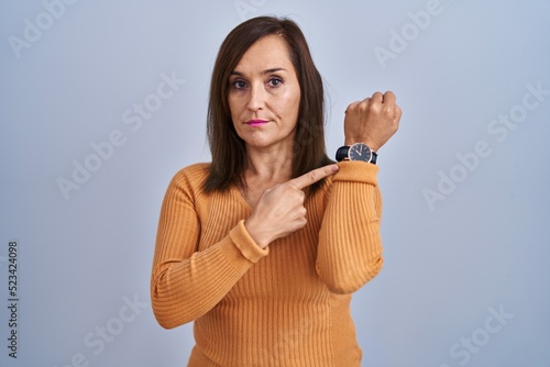 Middle age brunette woman standing wearing orange sweater in hurry pointing to watch time, impatience, looking at the camera with relaxed expression