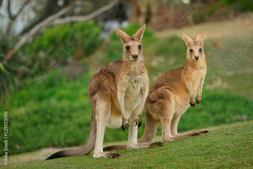 Eastern Grey Kangaroo (Macropus giganteus) on meadow, very cute animal with baby with green background, australian wildlife, queensland, Brisbane, brown pouched mammal, marsupial