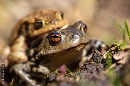 Płazy bezogonowe (Anura), ropucha szara (bufo bufo), środowisko naturalne, złote oczy, dwa kopulujące osobniki (5).