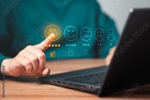 Man using a laptop in give rating to service experience on application. Online customer review satisfaction feedback survey and testimonial.