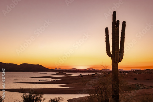 Saguaro cactus and pink sunset at Sonoran Desert Lake Pleasant in Phoenix Arizona