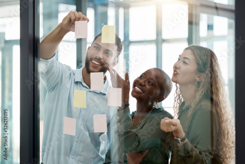 Diversity, collaboration and team in a business brainstorming strategy for planning and sticky notes. Creative people sharing ideas, plan and schedule work tasks in teamwork and delegation at office.