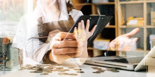 Portrait of Starting small businesses SME owners, two Asian woman check online orders Selling products working with boxs freelance work at home office, sme business online small medium enterprise