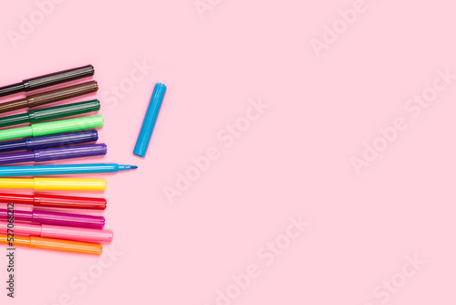 Juego de lápices de rotuladores multicolores sobre un fondo rosa pastel liso y aislado. Visa superior y de cerca. Copy space
