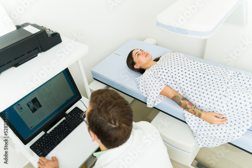 Hispanic patient getting a diagnosis with a densitometry x-ray test