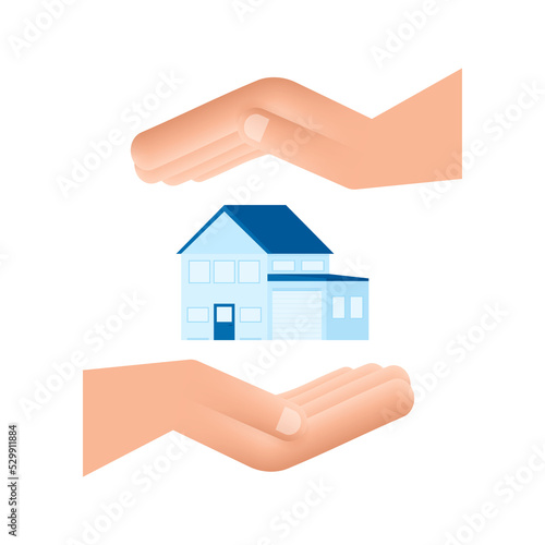 Businessmans hand holding a house. Home rental, property, real estate concept. Vector illustration. Technology concept.