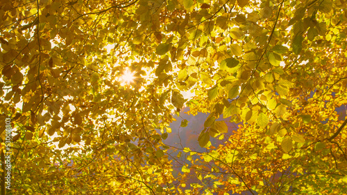 Sun peeking through lush beech tree branches with vibrant yellow autumn leaves