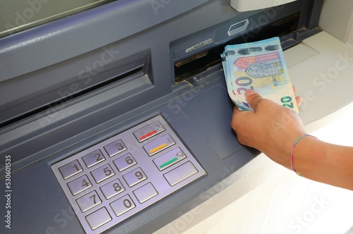 hand who withdraws money in european twenty euro banknotes in the atm automatic teller machine