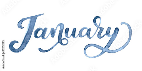January, month of the year in watercolor and brush letters. A beautiful lettering design of the word January to use in a calendar, diary, bullet journal, annual report or planner.