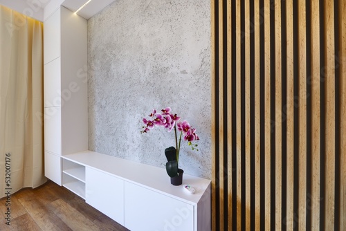 Piękny salon w nowoczesnym apartamencie z fioletowmy storczykiem