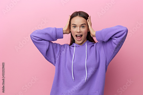 an enthusiastic woman stands looking forward on a pink background in a purple suit, smiling cheerfully, put her hands on her head