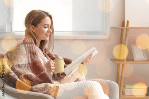 Beautiful woman with cup of tea reading book at home