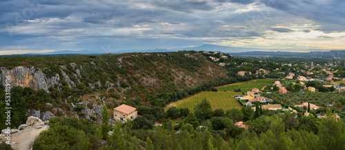 Widok na prowansalskie winnice, panorama. Zielone winorośla ukryte w zacisznej dolinie wśród wzgórz.