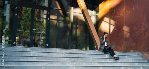 Far away view of a businesswoman working on a laptop while sitting on the stairs, texting messages on mobile phone. Modern communication. Modern technology.