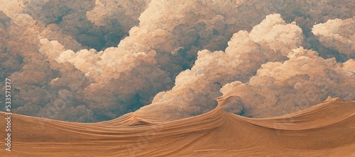 Endless desolate desert dunes, far horizon with spectacular clouds. Waves of surreal sand fabric folds landscape. Minimalist lost and overwhelming lonely feeling - moody subdued brown color tones.