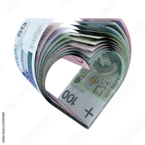 Banknoty PLN uformowane w kształt symbolu serca