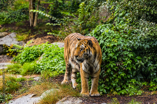 Majestic Siberian tiger on the prowl at Berlin Zoo, Berlin, Germany