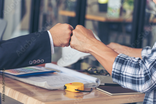 Two Men team fist bump Business Partner Businessman Trust Teamwork Partnership Industry contractor dealing mission business. Mission Business team meeting group of People Fist bump Hands together