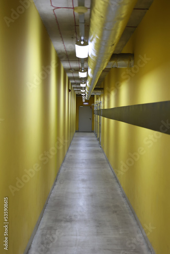 Żółty, długi korytarz z lampami na suficie. Zaplecza.