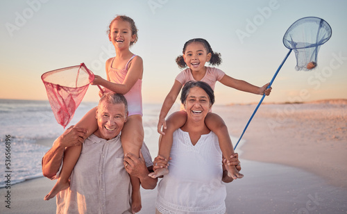Children, grandparents and fishing with a family on the beach during summer for holiday, vacation or travel. Kids, happy and ocean with a senior man, woman and their grandkids by the sea at sunset