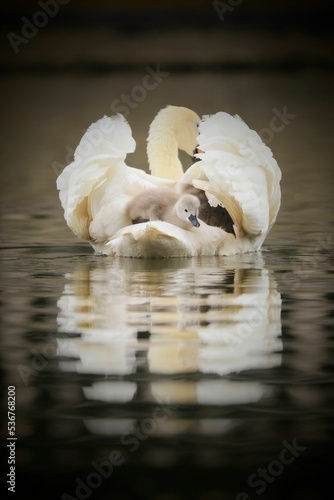 Vertical of a graceful white swan swimming on the lake carrying its baby, cygnet swan on its back