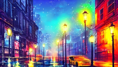 The city street is a calm oasis in the middle of the bustling metropolis. The colorful lights from the streetlamps reflect off of the pavement, creating a serene atmosphere.