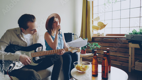 Creative musical duet is practising at home attractive woman is singing in microphone and handsome man is playing the guitar. Young cheerful people are wearing casual clothes.