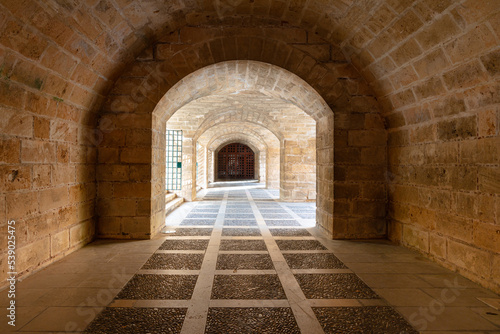 Pasadizo con arcos en el sótano de las murallas de Dalt Murada junto al Palacio Real de la Almudaina en Palma de Mallorca. Islas Baleares, España.