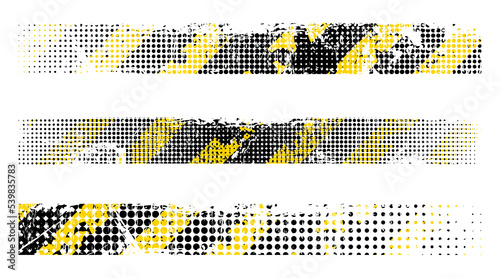 Grunge halftone signs with black and yellow diagonal lines. Warning tapes set.