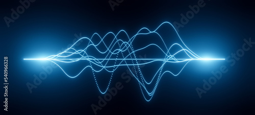 Bright glowing blue neon abstract wireframe sound waves, visualization of frequency signals audio wavelengths, futuristic technology waveform background with copy space for text