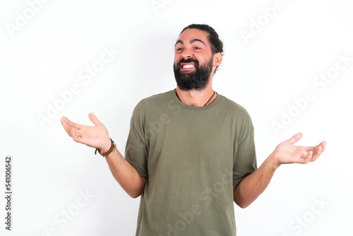 Clueless young bearded hispanic man wearing green T-shirt over white background shrugs shoulders with hesitation, faces doubtful situation, spreads palms, Hard decision