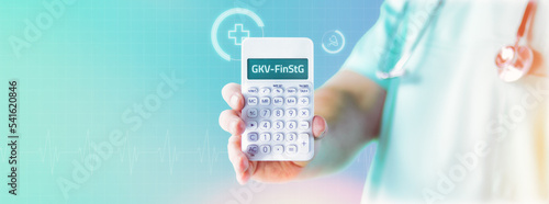 GKV-FinStG (GKV-Finanzstabilisierungsgesetz). Arzt zeigt Taschenrechner mit Text auf Display. Blauer Hintergrund mit Icons