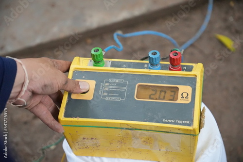 Technician is using a tester to measure electrical ground. Earth resistance tester.