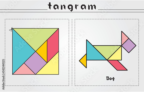 Colorful set of tangram game icons made with geometry shapes in abstract style, includes animals, vector illustration.