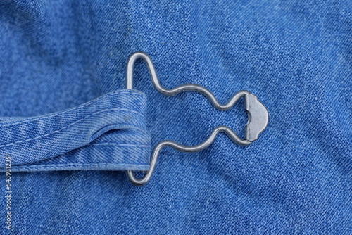 one gray metal fastener on a blue tulle fabric harness on clothes