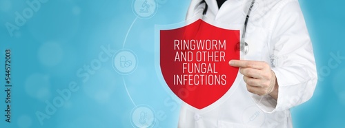 Ringworm and other fungal infections. Doctor holding red shield protection symbol surrounded by icons in a circle. Medical word