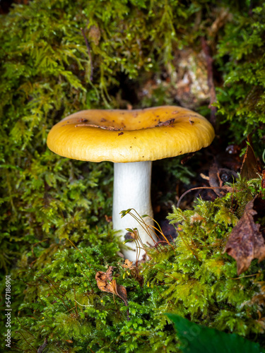 selective focus of a common yellow russula (Russula ochroleuca) on a forest floor with blurred background
