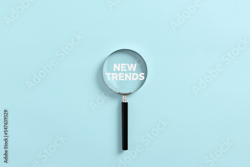 Magnifying glass magnifies the word new trends. Analyzing or searching for the new trends