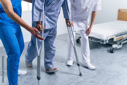 松葉杖を使ってリハビリする患者とケアスタッフ