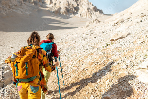 Two tourists with backpacks in the mountains. Tourists travel through the rocky mountains. Active rest in mountain hiking. Adventure in the mountains. .