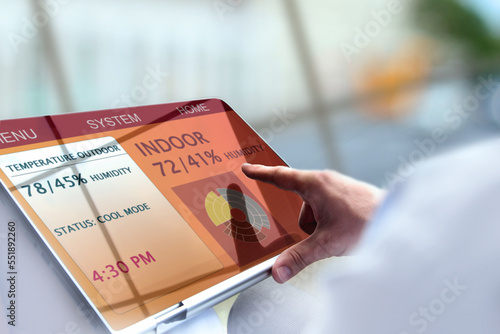Man is Adjusting a temperature on the thermostat using a tablet with smart home app.