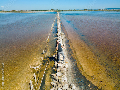 uomo che parla al telefono ripreso dall'alto che si trova in un limbo di terra che attraversa uno stagno