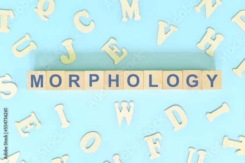 Study morphology in linguistics concept. Wooden blocks word typography flat lay in blue background.