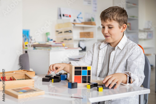 Happy male kid assembling Montessori material trinomial cube at school classroom desk