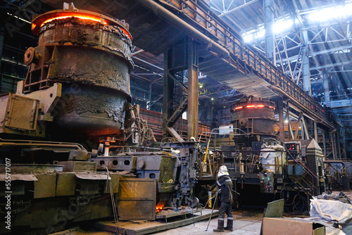 View from inside the shop of a steel mill. Ladle of hot metal at a large metallurgical plant. Melting pig iron and steel.