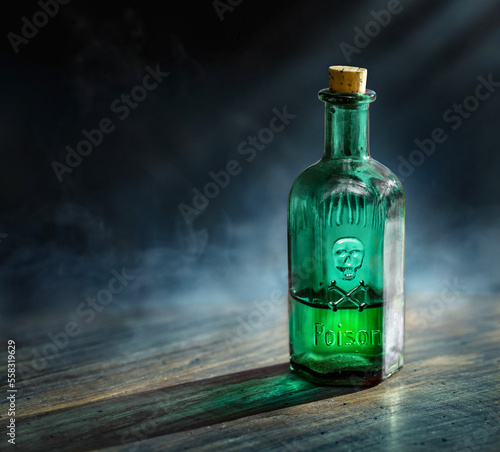 Glass poison bottle with skull and bones. Danger sign, symbol of death. Concept background on poison poisoning, chemistry, medical, old science topic. Poison, venom, toxin, toxic background.