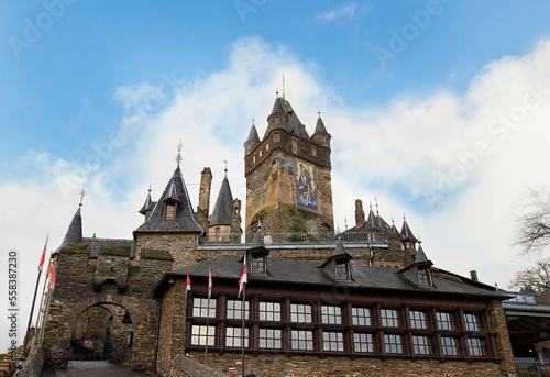 Gate of Reichsburg Castle, which rises on the hill above the Moselle River in city of Cochem, German